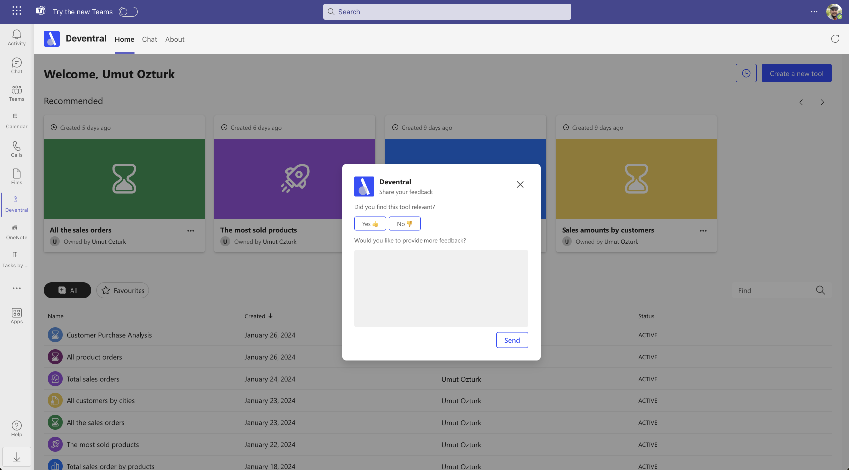 As micro tools are generated by AI, users can give feedback easily by giving a relevancy result and an open-ended feedback as below. The Deventral team instantly receives the feedback and evaluates it to improve the systems for the better.